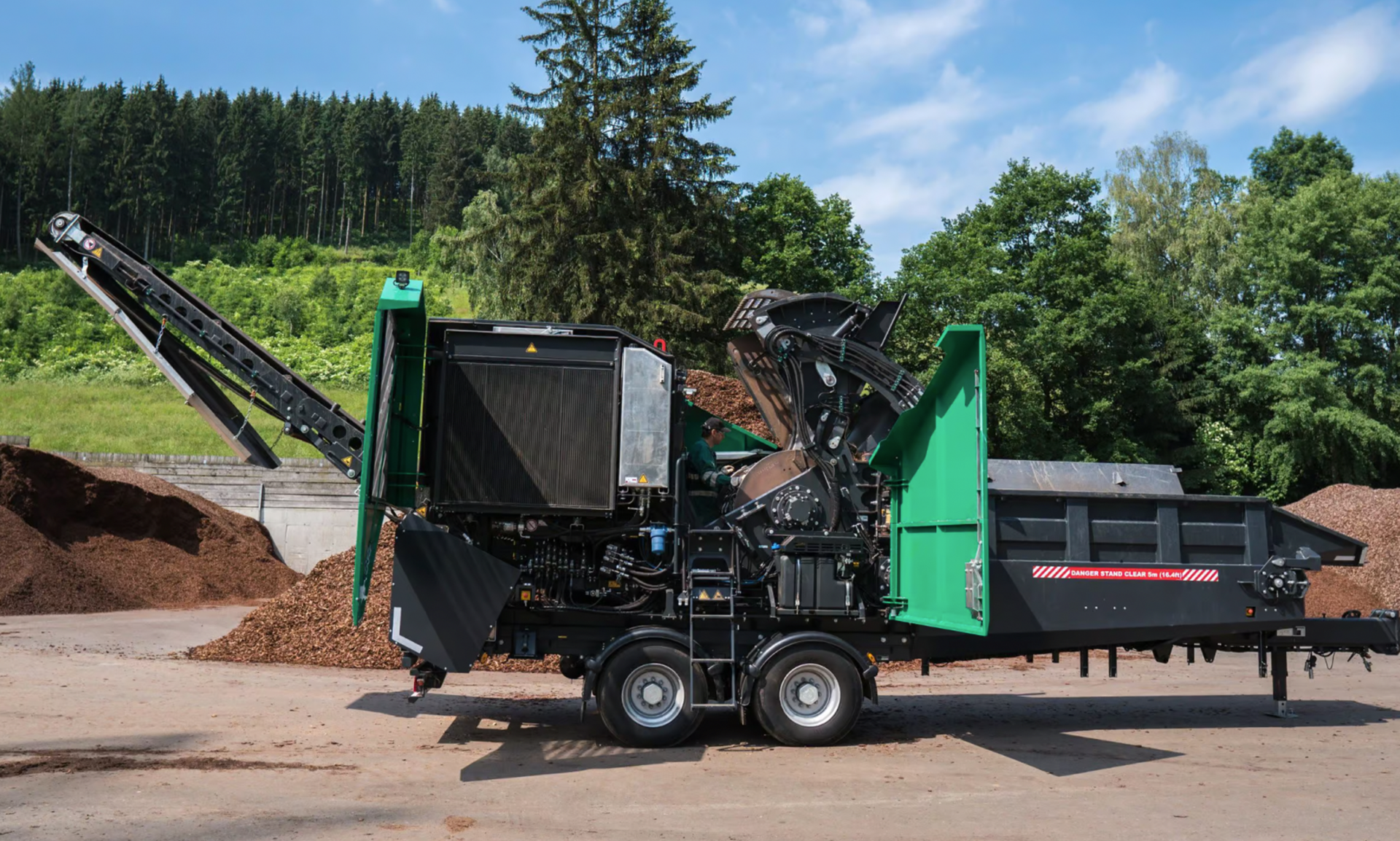 The Axtor machine is highly adaptable and can effectively process wood and green cuttings. The Axtor 4510 model, with its 462 HP engine and weighing less than 19 tonnes in the trailer version, is ideal for entry-level and medium-capacity needs. However, for more demanding tasks, the Axtor 6210 offers even more power with its 585 HP engine.